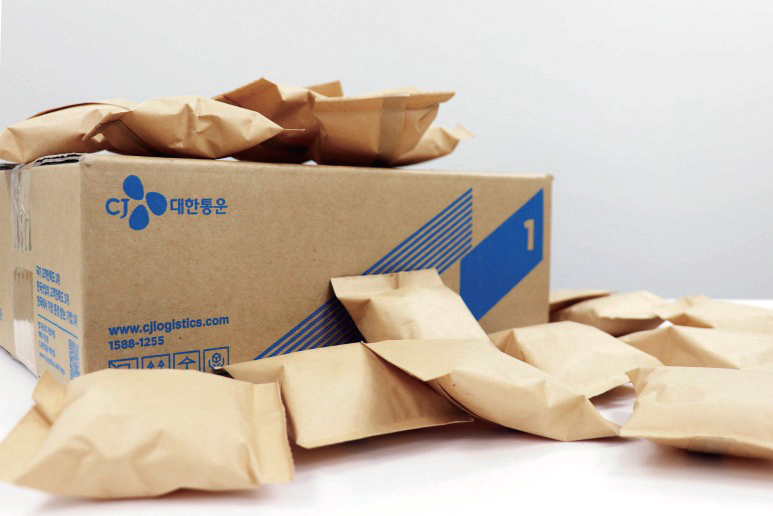CJ대한통운은 택배 박스에 자체적으로 개발한 친환경 종이 완충재를 사용하고 있다. 택배 박스 만큼이나 완충재 역시 스티로폼 등 재활용이 어려운 소재로 사용되는 경우가 많아 환경파괴의 주범으로 손꼽힌다. CJ대한통운은 이러한 점을 해소하기 위해 종이와 베리어 코팅제를 소재로 한 종이 완충재를 개발했다. 이 완충재는 종이포장 안에 공기를 주입한 형태로 많은 무게를 견딜 수 있어 제품의 보호능력이 우수하다. 뿐만 아니라 종이를 소재로 해 재활용이 가능하고 가정에서도 분리수거가 가능하다는 장점도 있다. CJ대한통운 관계자는 “현재의 물류에서 친환경은 가장 중요한 주제 중 하나”라면서 “향후 고객사들과도 친환경 물류의 확산을 위한 공감대를 확대해 나갈 방침”이라고 덧붙였다.