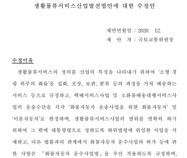 지난해에만 택배근로자 16명이 사망했고, 이중 15명은 과로사로 추정된다. 부디 어렵게 국회를 통과한 이번 법안이 택배현장의 사망사고를 멈추고, 택배기업과 근로자, 그리고 생활물류서비스를 이용하는 소비자 모두에게 사랑받는 법안으로 연착륙하기 위한 고민이 절실한 시점이다.