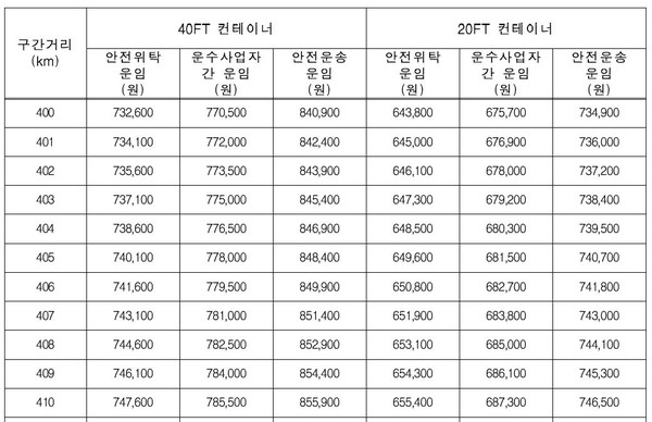 40FT 컨테이너 404km 운송 시 안전운송 운임 84만 7천원, 안전위탁운임 73만 8천원