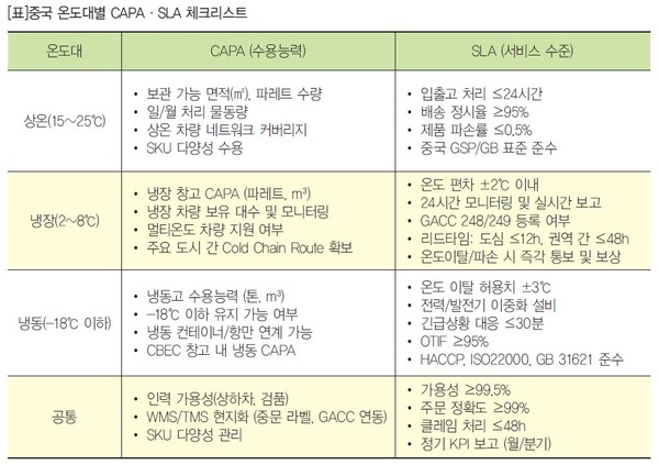 중국 시장에 진출하려는 한국 식품기업에게 물류 전략은 성공의 핵심 요소다. 우선 채널 전략에서는 일반무역과 CBEC(보세재고형 1210, 직구형 9610)를 병행해 리드타임, 세율, 재고회전율, 그리고 마케팅 노출 효과까지 통합적으로 비교·검토해야 한다. 컴플라이언스 측면에서는 GACC 248·249 등록, 중국 라벨 내 등록번호 표기, GB 규격(Guo Biao: : 중국국가표준) 준수, 성분 및 유통기한 관련 규정을 사전에 꼼꼼히 점검해야 한다. 또한 콜드체인 설계에서는 다중온도 존을 활용하고 혼적·혼온도 문제를 방지하며 편의점·카페·신선소매 채널(Hema/Freshippo 등)에 대응할 수 있는 도심형 분배망까지 고려해야 한다. 허브 선택도 중요한데, 칭다오를 기점으로 화북·동북·산둥권에 분배하는 전략과 상하이·화남 지역을 거점으로 SKU 다양성이 큰 브랜드를 운영하는 방안을 병행해 비교해야 한다. 이 과정에서 aT의 지원과 민간 3PL의 처리 역량을 균형 있게 평가할 필요가 있다. 마지막으로 데이터 가시성은 필수 요건으로 TMS·WMS와 플랫폼 데이터를 연동해 환불, 파손, 온도 이탈, 리드타임을 주 단위로 관리해야 한다. OTIF(On Time in Full: 납기·수량 준수율), 온도 이탈률, CBEC SLA(Service Level Agreement: 서비스 수준 협약) 같은 KPI를 통해 물류 성과를 체계적으로 관리해야 한다. 즉, 한국 식품기업이 중국 시장에서 안정적으로 성장하기 위해서는 수출 현황에 대한 정확한 데이터와 더불어, 철저한 물류 체크리스트를 기반으로 전략을 수립하는 것이 무엇보다 중요하다.