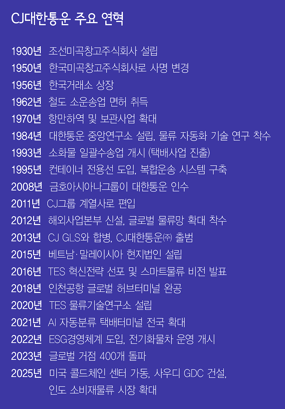 단순 운송을 넘어 산업 생태계를 구축하는 역할까지 수행 중이다. CJ대한통운의 95년은 곧 한국 물류산업의 발전사이며 기업의 생존전략은 언제나 변화 속에서 ‘표준’을 새로 세워온 과정이었다. 기술과 인프라, 글로벌 네트워크를 결합한 CJ대한통운은 이제 100년 기업을 향해 물류의 새로운 시대를 설계하고 있다.
